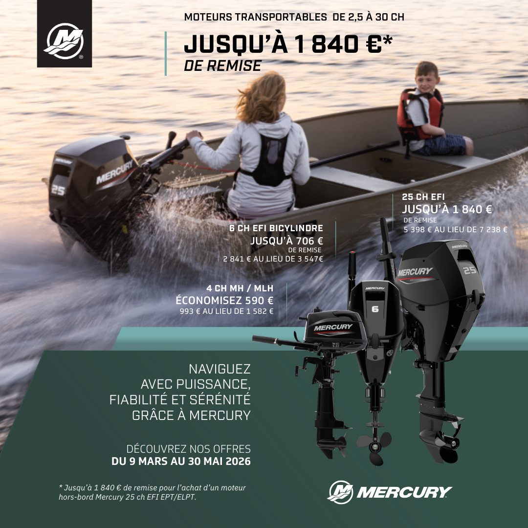 Voici une offre à ne pas manquer sur les moteurs hors-bord Mercury de 2,5 à 30 ch : jusqu’à 1 840 €* d'avantages sur plusieurs modèles de moteurs transportables !