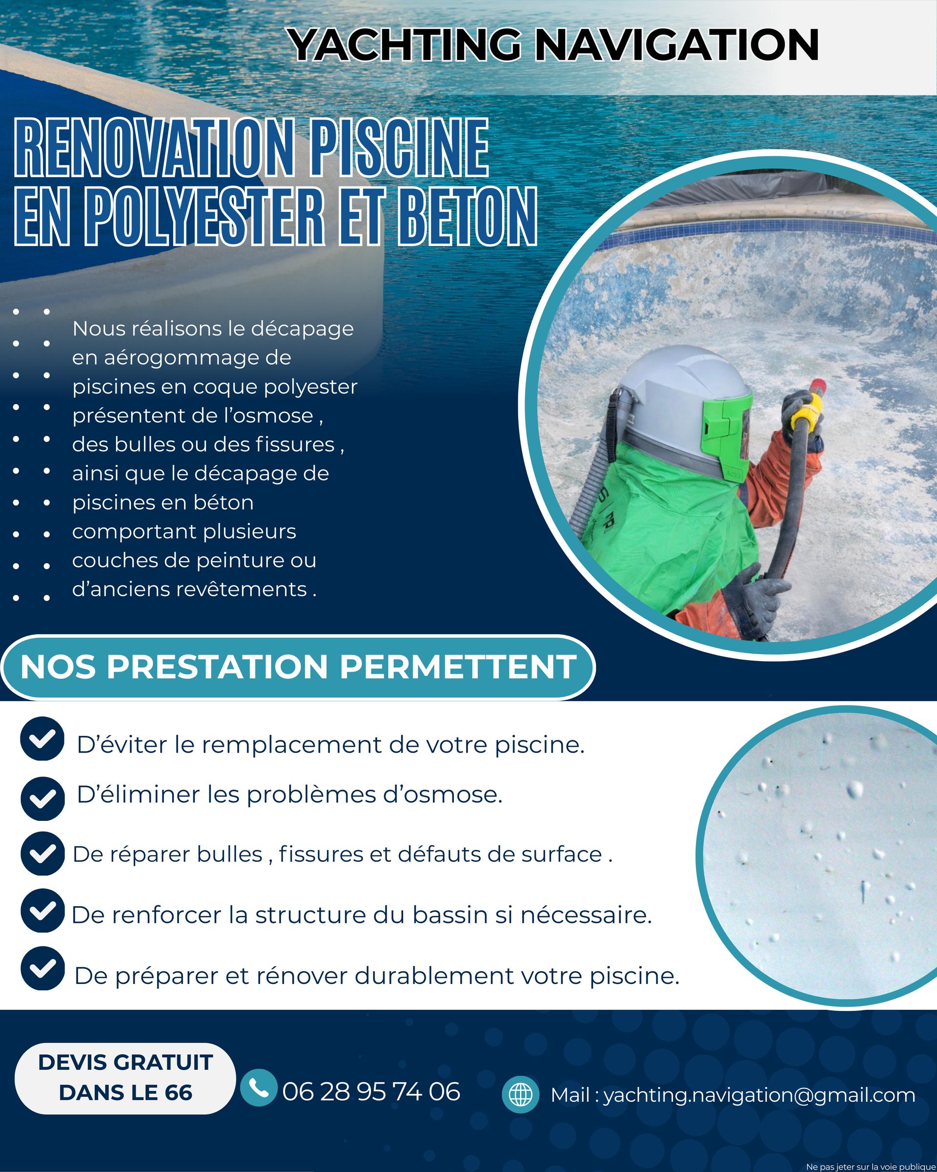 Décapage et rénovation de piscines. L’entreprise Yachting Navigation, basée à Saint-Cyprien (66), intervient dans tout le département des Pyrénées-Orientales pour le décapage, la rénovation et la remi...