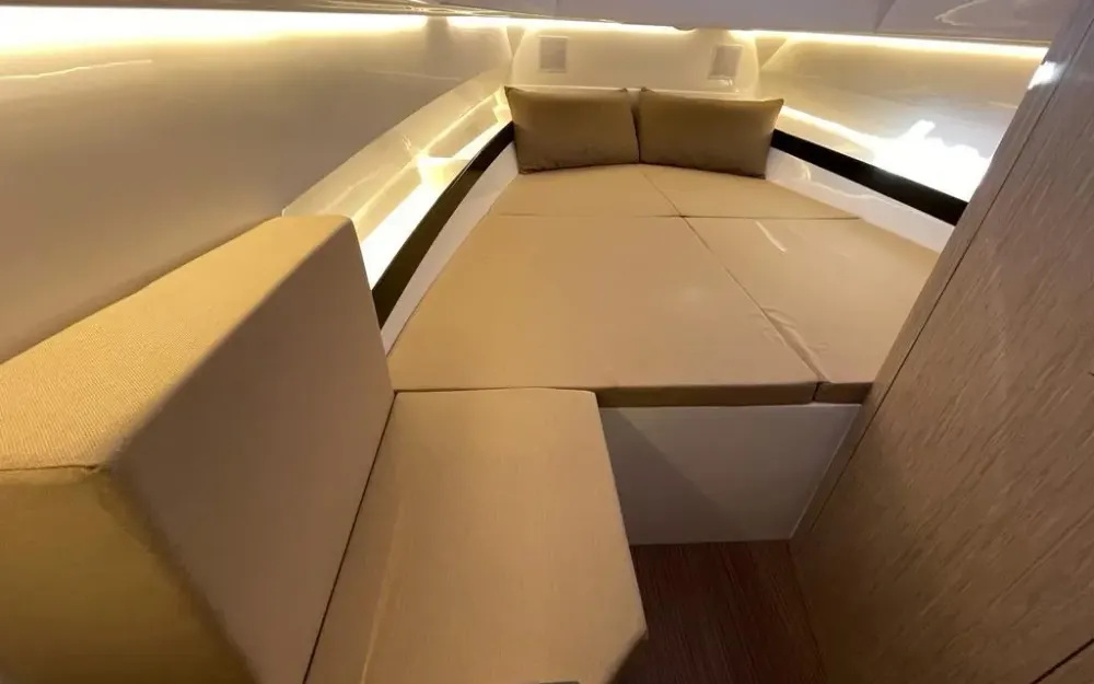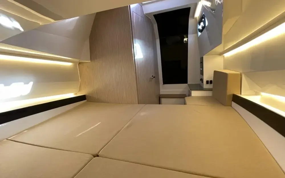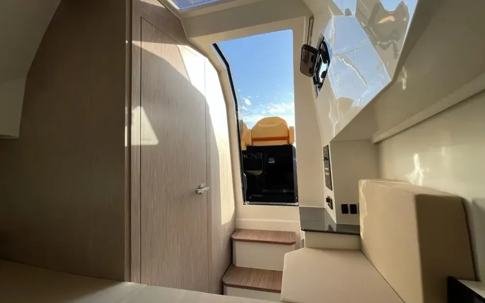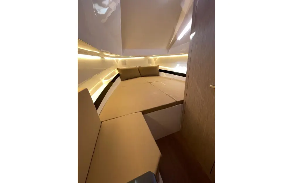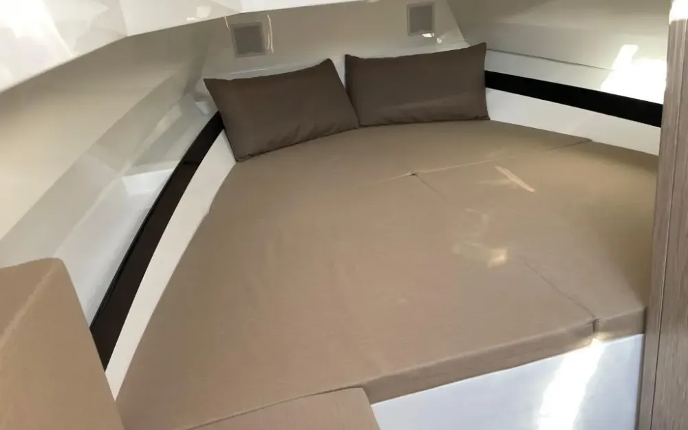 Dès le premier regard, son cabine parfaitement aménagée invite au bien-être, tandis que ses deux bains de soleil, à l’avant et à l’arrière, prolongent l’espace de détente. À l’arrière, le bain de soleil se transforme aisément en coin repas grâce à une table télescopique intégrée.