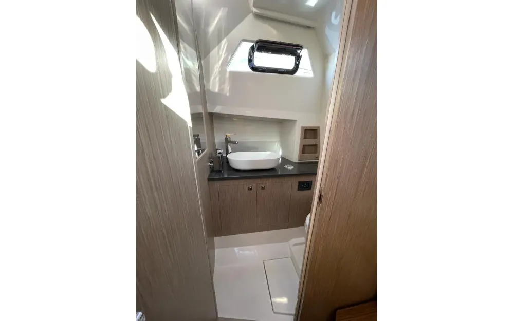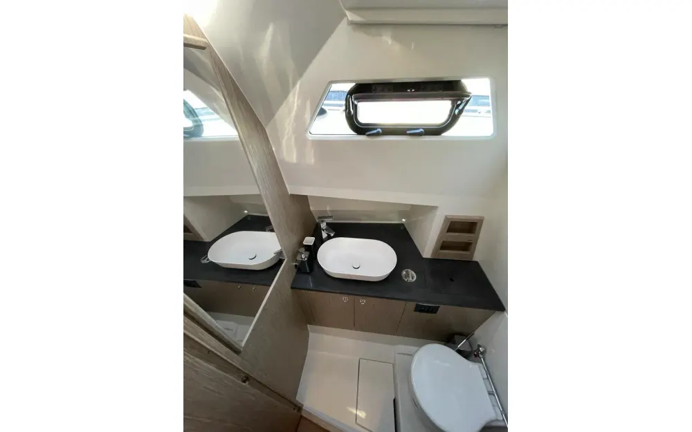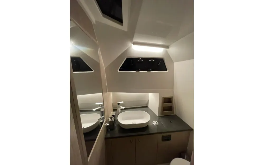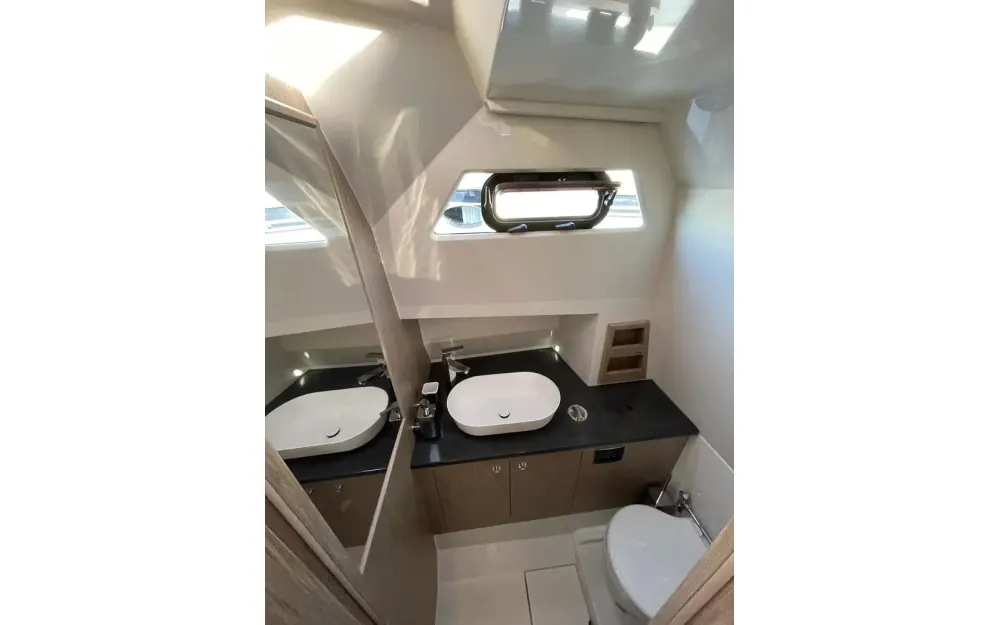La console arrière intègre un évier design, un plan de travail fonctionnel, un compartiment de rangement pratique, ainsi qu’un grand réfrigérateur à tiroir. Un second espace réfrigéré, astucieusement dissimulé sous une assise du carré arrière, complète cet aménagement. Une machine à café premium est disponible à bord, alimentée en toute autonomie grâce à un convertisseur.